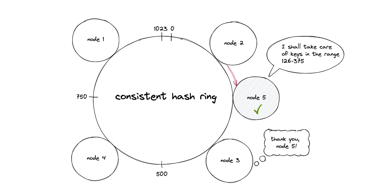 Note that nodes might start having uneven load because when a node is removed or goes offline, all of its load/data are moved to the next node, which can cause cascading failures.