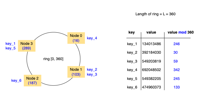We then use the same hash function that is where is the length of the ring, to place data onto the ring. Data is stored on the first node in front of where it landed. This allows us to have even data distribution given that our hash function is uniform.