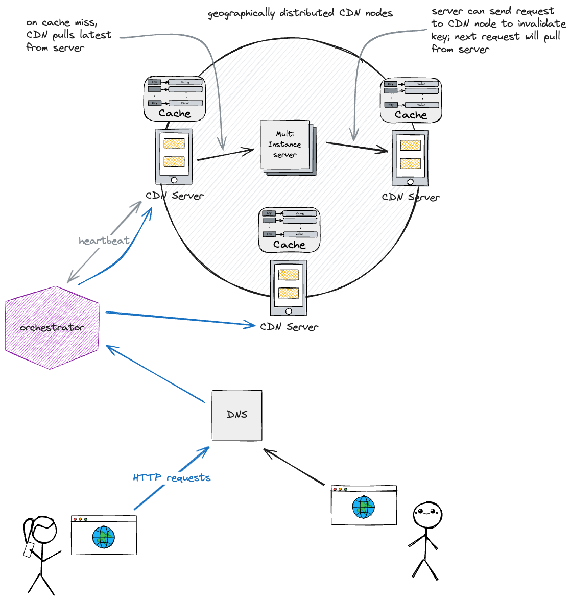 - Added in an unnecessary “orchestrator” node, when in reality the distributed DNS server is the one that routes traffic to geographically close CDN nodes, as well as handling backup routing in the case of outages. (In the unicast approach, as opposed to Anycast).