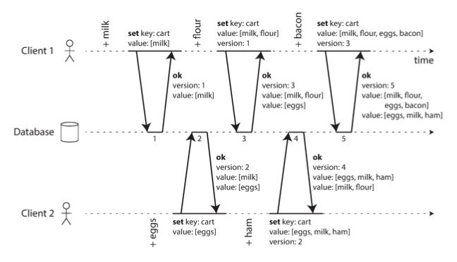- The application submits the merged data with the version number it previously received, and the database can now overwrite all prior versions of the row/key.