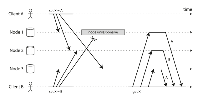 We can achieve this through the versioning of rows/keys in a database, and relying on the application to deal with any conflicting information that it receives.