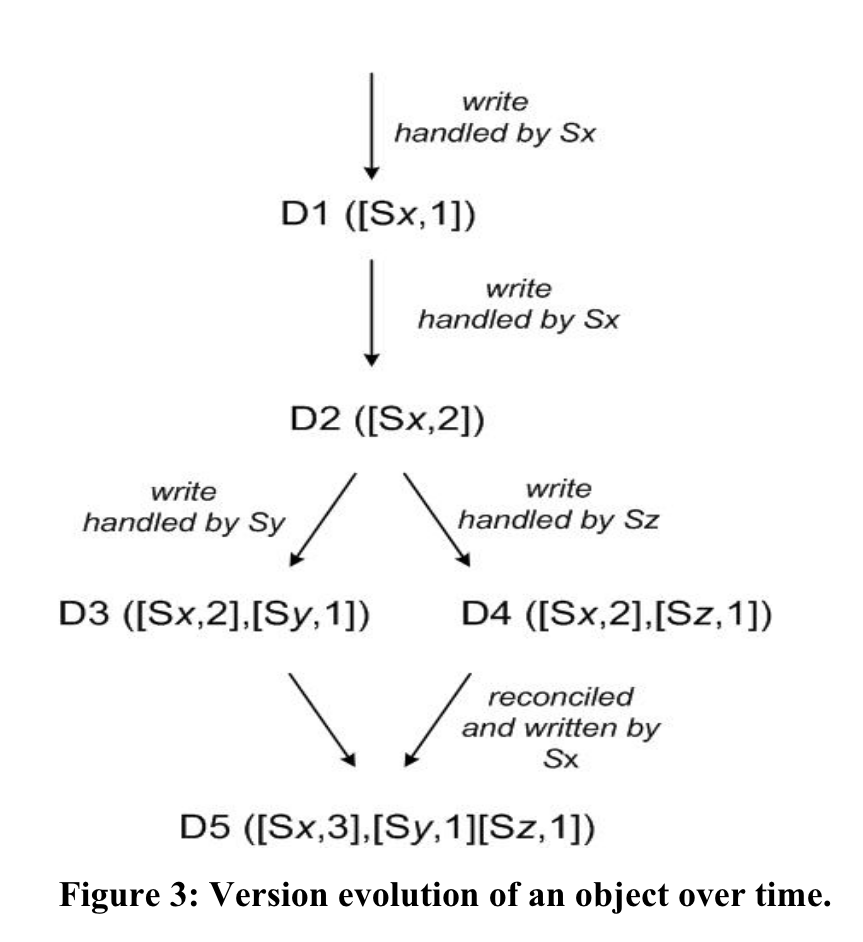 “Dynamo uses vector clocks [12] in order to capture causality between different versions of the same object.” (DeCandia et al., p. 200)
