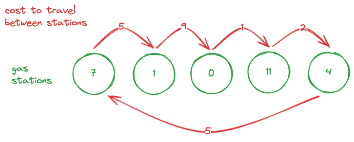 You have a car with an unlimited gas tank and it costs cost[i] of gas to travel from the ith station to its next (i + 1)th station. You begin the journey with an empty tank at one of the gas stations.