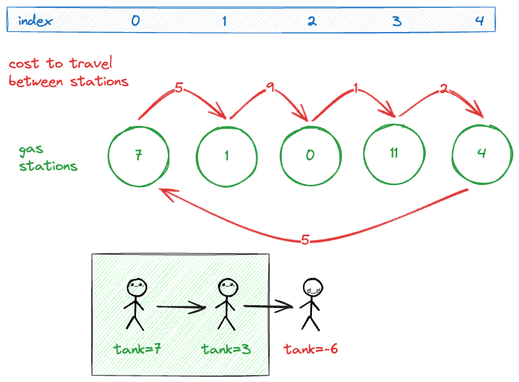 We start at index 0 with an initial gas tank of 0, and then fill up with the 7 gas available at the station. We manage to make it to index 1, but can only reach index 2 with a negative gas tank.