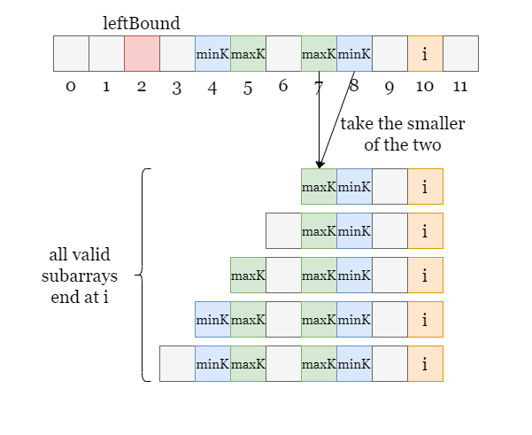 Then, for subarrays ending at index , we know that we can enumerate the left bound of the subarray to be any index between the previous oob value (non-inclusive) and the leftmost value out of minK and maxK.