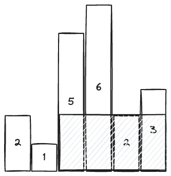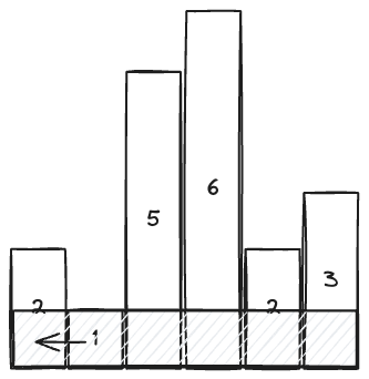 This gives us an intuition for how to solve this problem. We will try to find the largest rectangle that we can draw using each bar . When we encounter a shorter bar as we iterate from left to right, we know that the previous bars that are taller must now end, and we calculate the area that we amassed.