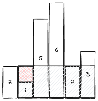 Thus, when we are ending the accumulation of prior taller bars, we need to keep track of how many we pop off, and extend the new shorter bar that we’re pushing onto the stack as far left as we popped off (as every prior bar we popped off the stack is taller than the current bar, and so the current bar’s rectangle can extend back through those bars).
