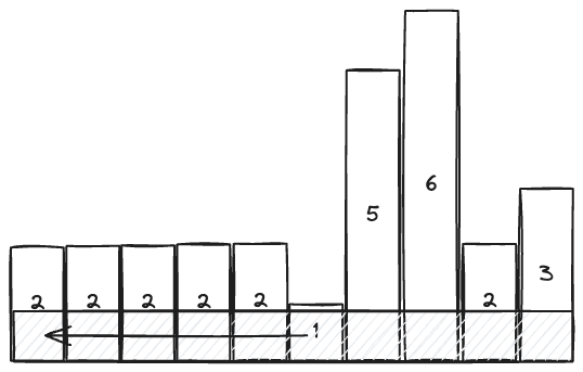 In a non-special case, such as the first rectangle, we know that the rectangle’s left bound is just it’s own index. However, consider the second bar in the diagram above. We can see that it’s index will actually extend to the left, including the first bar of height 2.