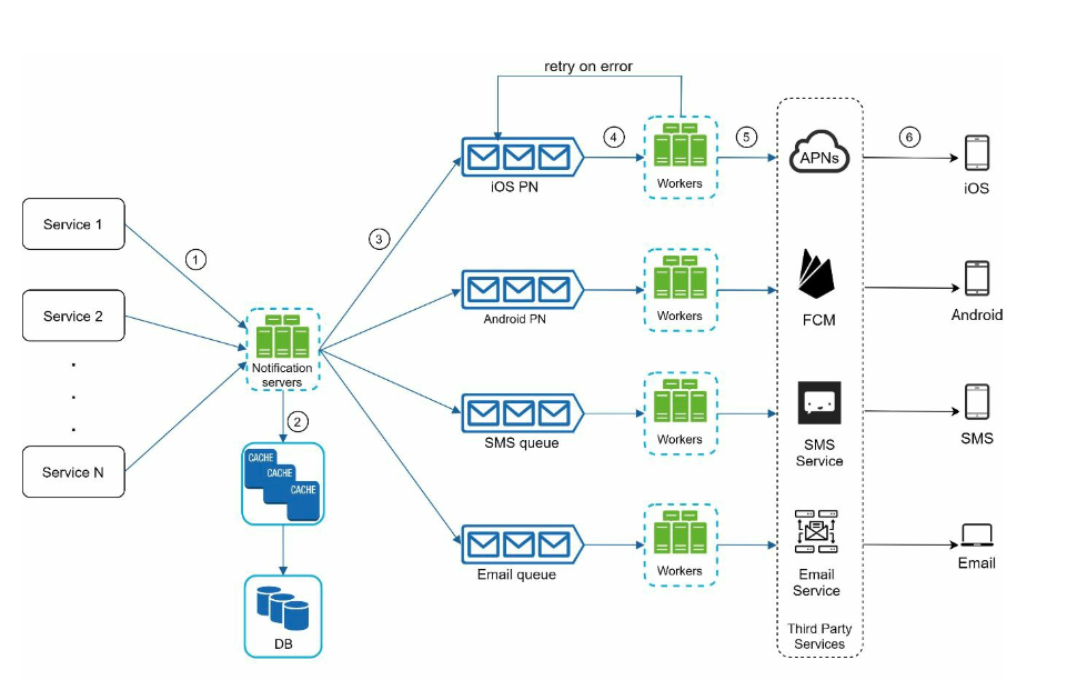 - we have to make sure notifications aren’t lost, so we can store notification data in a log database.